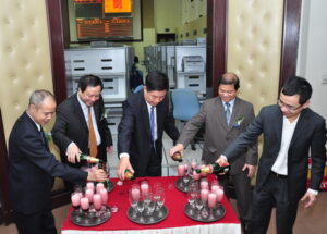 Lãnh đạo Sở GDCK Tp. HCM và Vinacafé Biên Hòa mở sâm panh chúc mừng