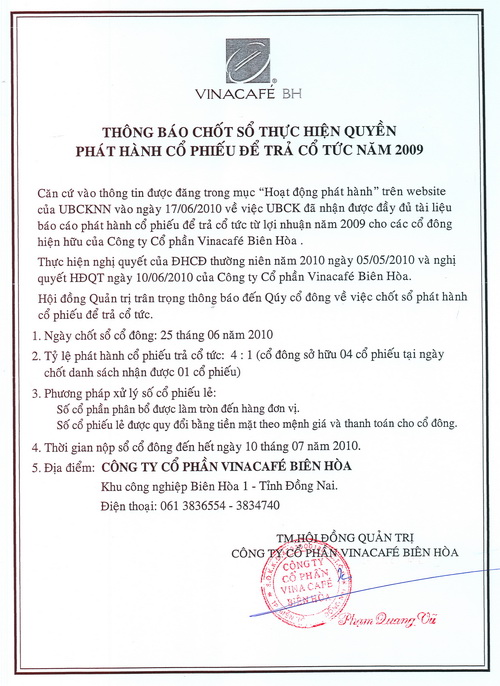 Thực hiện nghị quyết của ĐHCĐ thường niên năm 2010 ngày 05/05/2010 và nghị quyết HĐQT ngày 10/06/2010 của Công ty Cổ phần Vinacafé Biên Hòa.