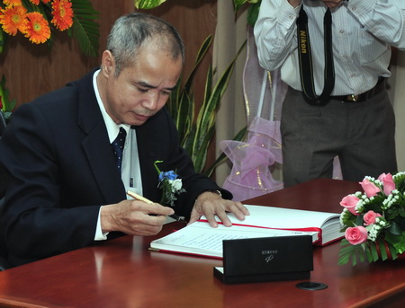 Ô. Phạm Quang Vũ - Tổng giám đốc Vinacafé BH ghi lưu bút và ký vào Sổ lưu niệm của HOSE